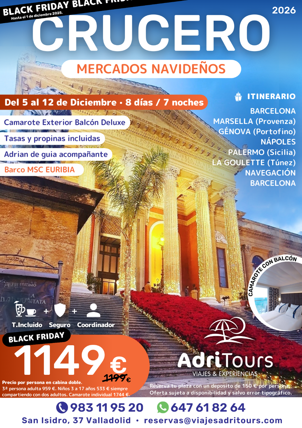 - Itinerario:BARCELONA, MARSELLA (Provenza), GENOVA (Portofino), NAPOLES, PALERMO, LA GOULETTE (Túnez), NAVEGACIÓN, BARCELONA.